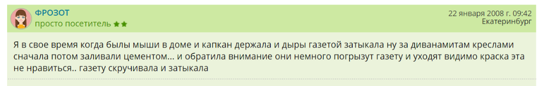Газету, по отзывам, мыши, как и моль, очень не любят. Все дело в типографской краске, очень неполезной для здоровья. Одной даме с форума это помогло.
