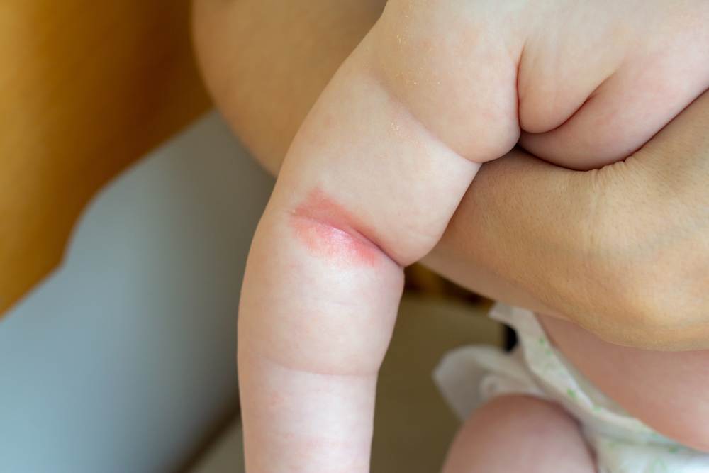 - в виде узелков или пузырьков на фоне красной кожи, которая при этом не сливается в единую «картину»; такие высыпания чаще всего могут появляться в кожных складках — на шее, в паху, в подмышечных впадинах; они могут вызывать боль, а также сильно зудеть (это становится очевидным, когда малыш пытается почесывать покраснения); подобные симптомы могут держаться 1-2 недели;
