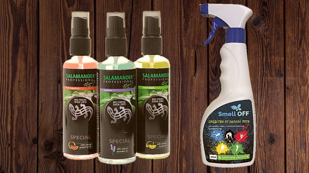 Чтобы заблокировать едкий запах плесени, мочи или пота в спортивной или повседневной обуви, применяют универсальный спрей Smelloff. Средство ликвидирует источник запаха за счет ингредиентов: эфирных масел, ПАВ, растительных энзимов. Спрей используют вечером, утром подсохшие чистые туфли обувают. Не разрушает материал, не оставляет пятен.