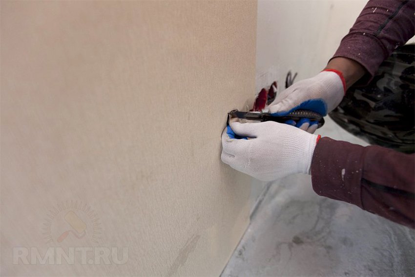 Излишки обоев сверху срезают при помощи широкого металлического шпателя, служащего основой и ограничителем, и канцелярского ножа. Снизу обои можно подрезать ножницами, если плинтуса были демонтированы, или, так же как и сверху, если плинтуса остались.