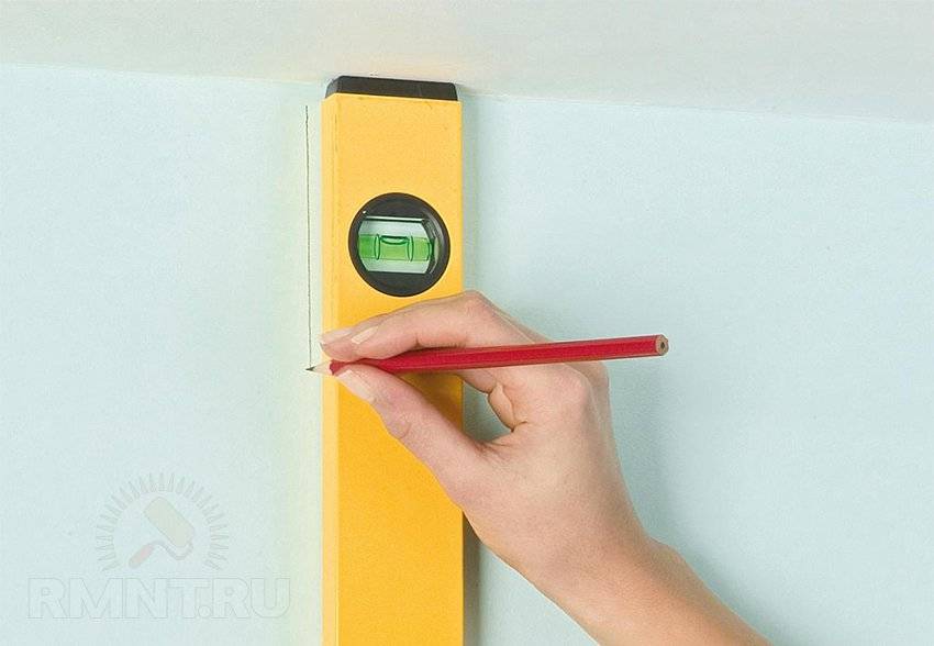 Тогда вертикальную линию нужно отвести, отступив не менее 54 см от угла, располагая кромку параллельно линии разметки, меньше шансов отклониться от неё, нежели пуская обои прямо по ней.