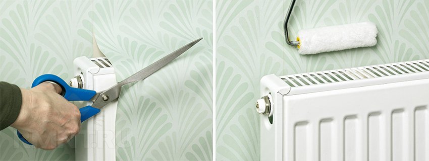 Если радиатор не представляется возможным снять, то достаточно завести полоски обоев по его периметру на глубину около 15 см с каждой стороны. Рекомендуется дополнительно промазать клеем поверхность стены за батареей, особенно, если она работает.