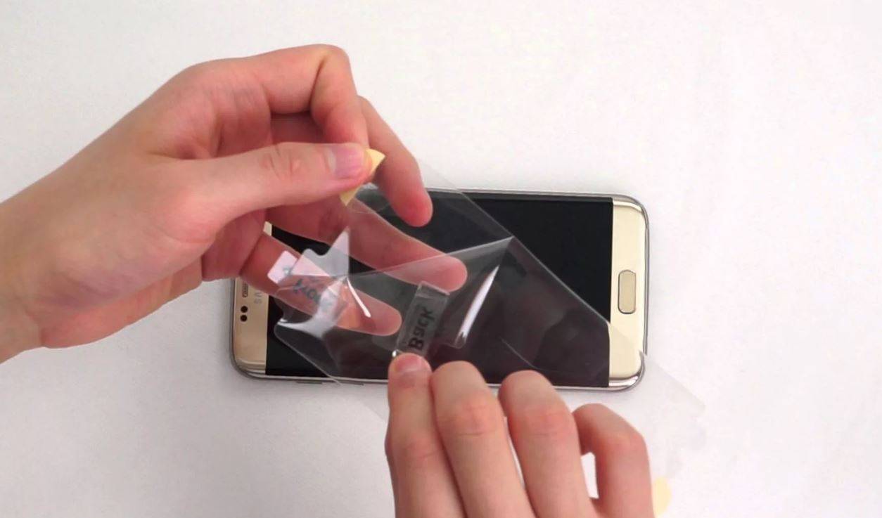- Снимают защитные компоненты с той области, которую потребуется приклеить к смартфону.