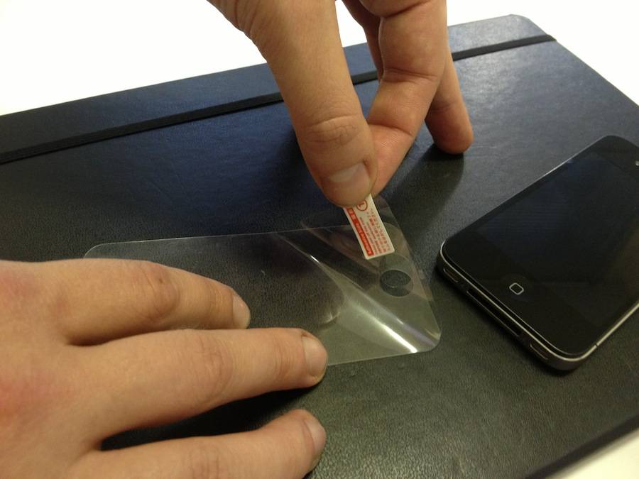 Опять же перед наклейкой необходимо проверить отсутствие пыли, если нужно, положить устройство в пакет, чтобы изолировать его от внешней среды. Не следует сразу снимать транспортировочное покрытие, так вероятность испортить пленку и попадания на клей пыли достаточно высокая. Сначала нужно снять покрытие на 1/5 от всей длины пленки. Как наносить пленку — горизонтально или вертикально — зависит от вас и от места расположения стикера.