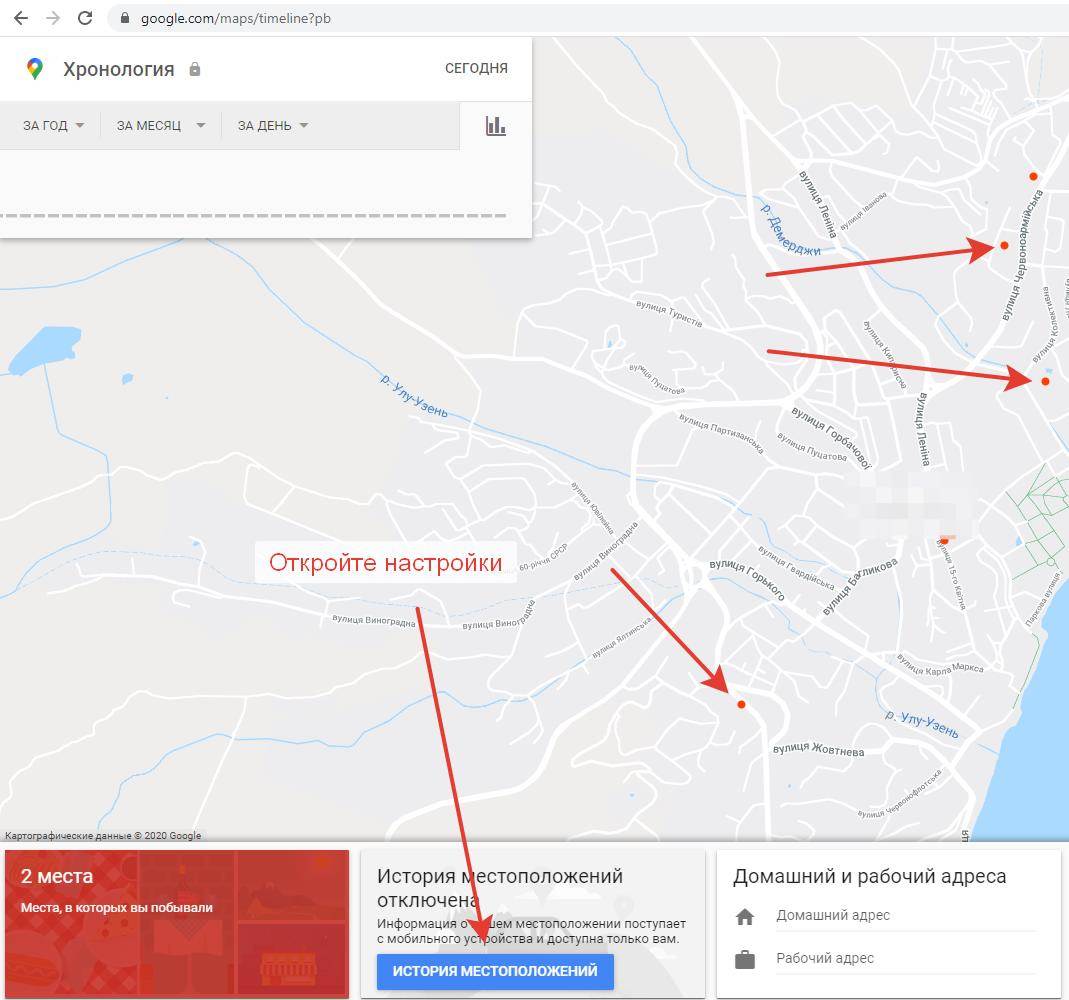 По умолчанию в указанном разделе показан маршрут перемещения человека за текущую дату. Последняя точка, отмеченная на карте, указывает местоположение искомого пользователя.