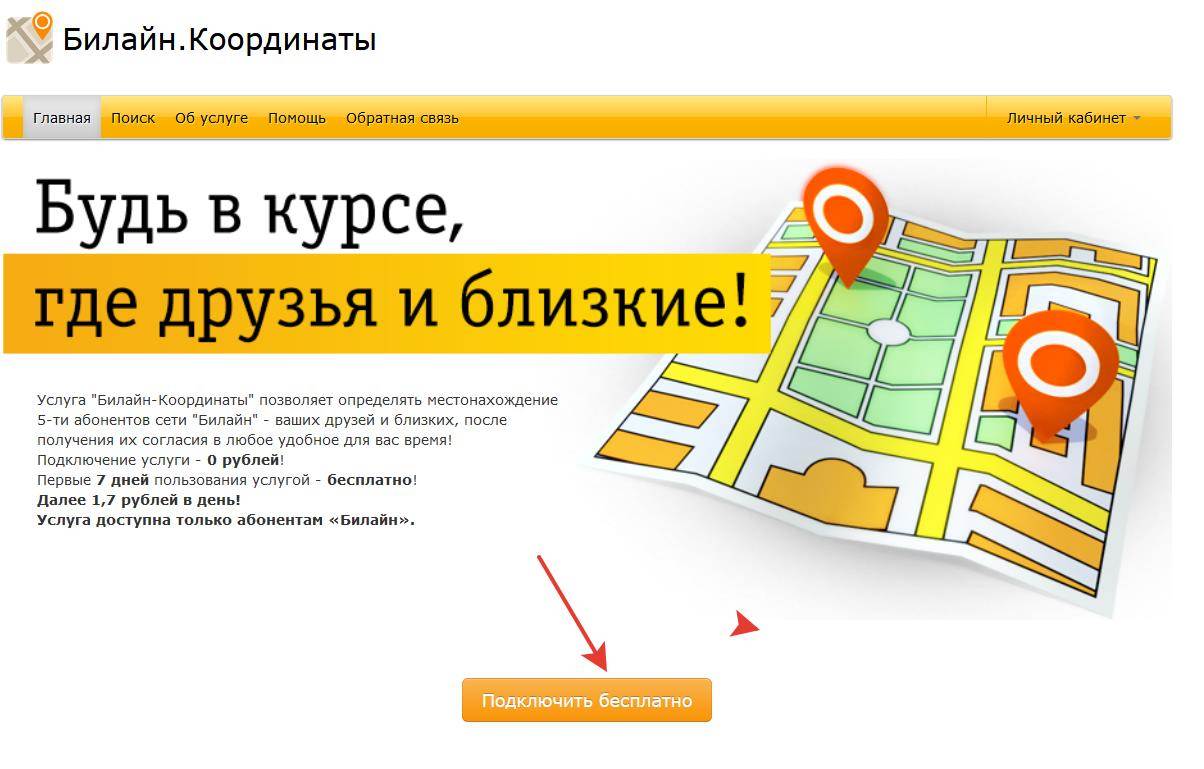 - У оператора Beeline услуга называется «Билайн-Координаты» и стоит 1,7 рублей в сутки.