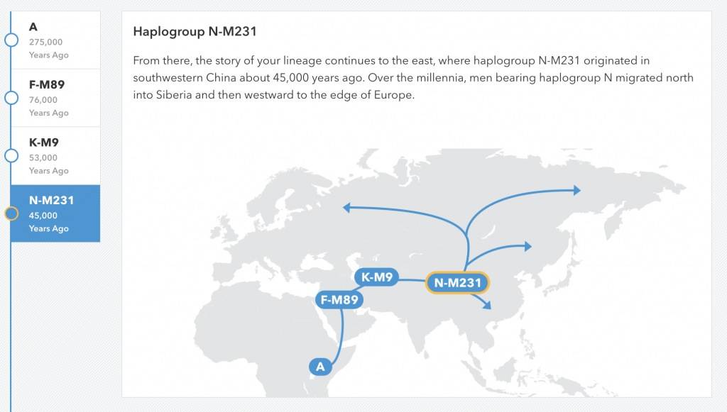 По ним можно предположить, как и откуда мигрировали ваши далекие предки. 23andMe считает, что по отцовской линии меня можно отнести к группе N-Z1936, которая стала веткой группы N-M46, образовавшейся примерно 12 тыс. лет назад в северном Китае, и постепенно, вместе с населением, мигрировала в сторону Уральских гор и далее вплоть до стран восточной и северной Европы. Если провести исторические параллели, то становится ясно, что речь о хунну или гуннах.