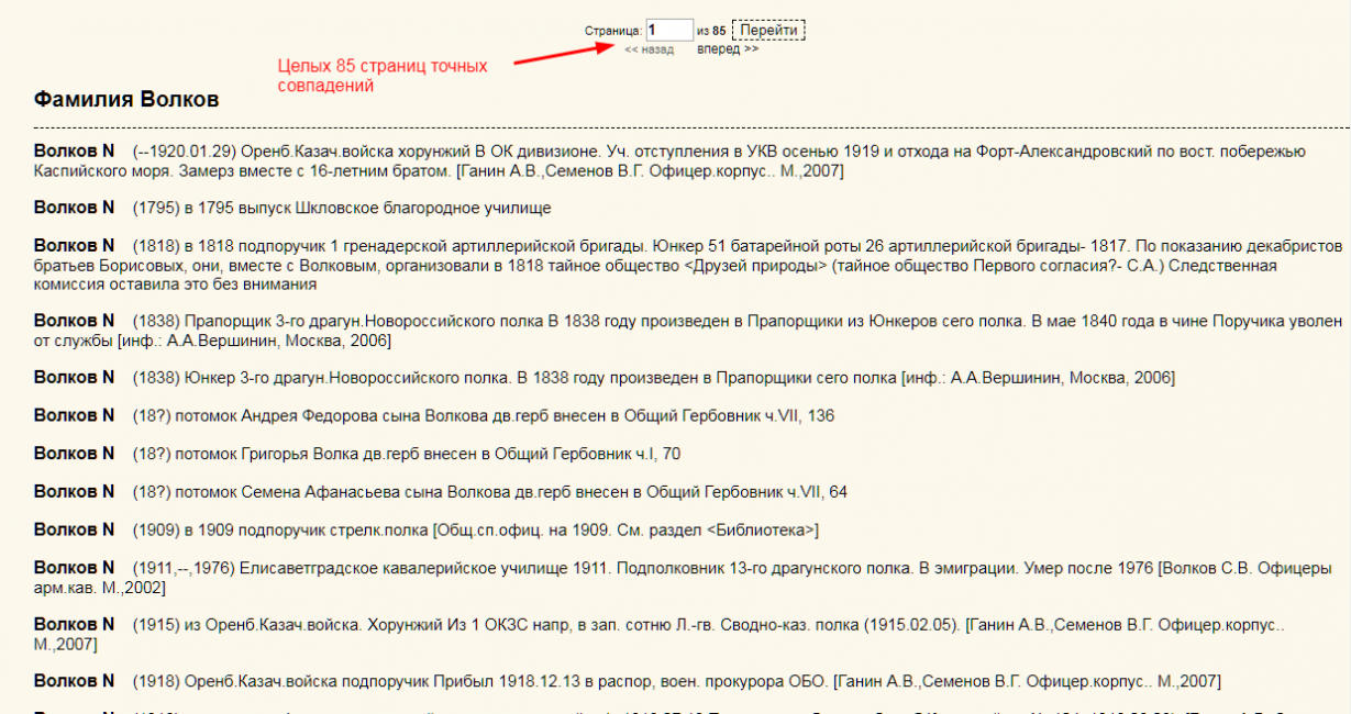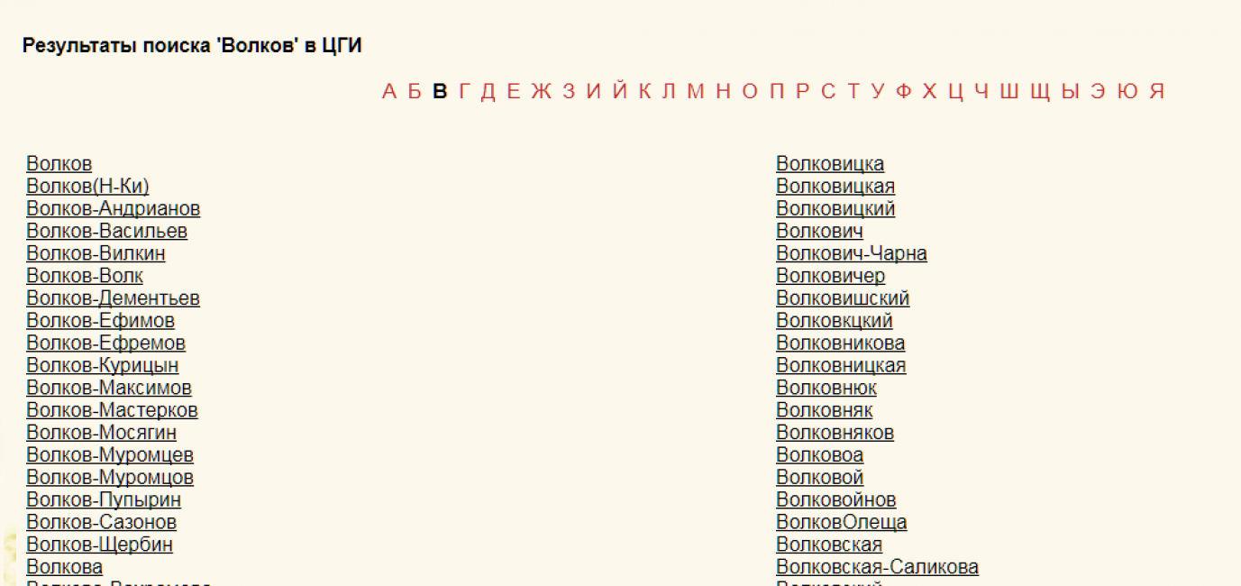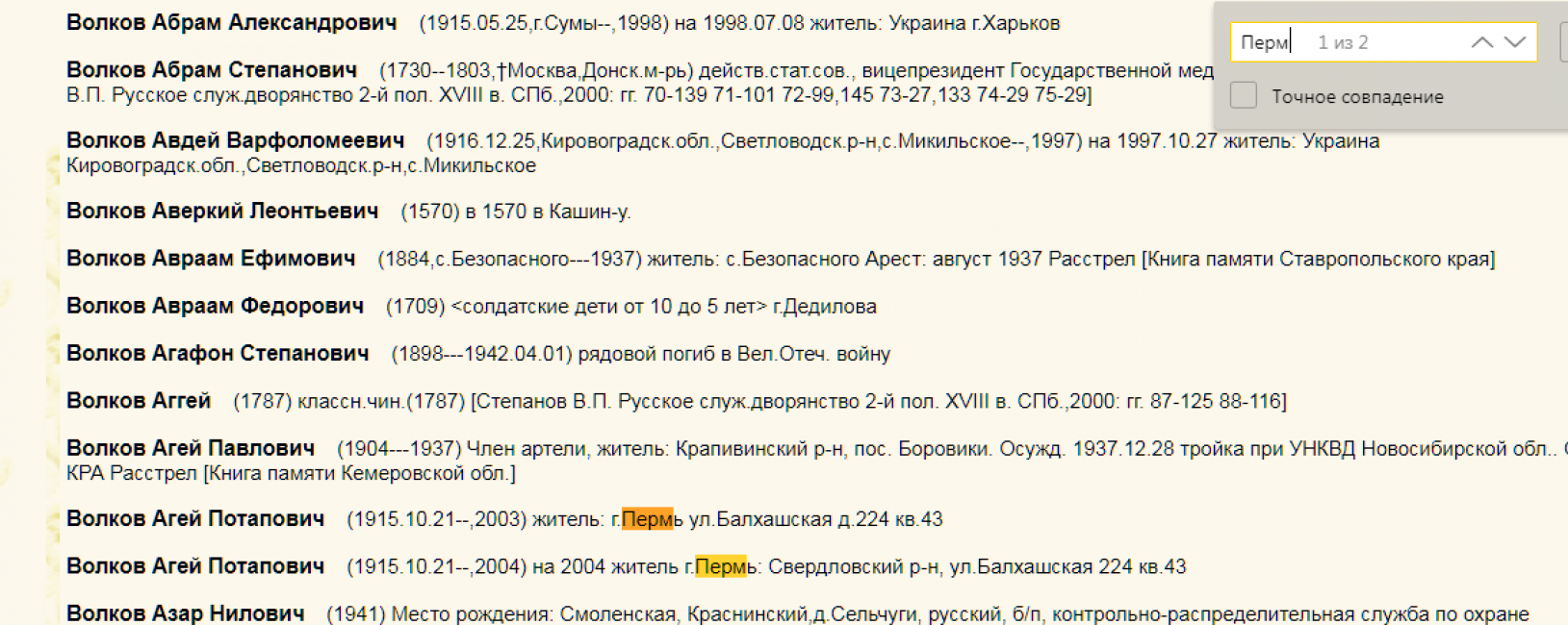 В данном случае была введена фамилия «Волков», но фильтр был «неточным», поэтому в результате высветился целый список однокоренных и похожих фамилий.
