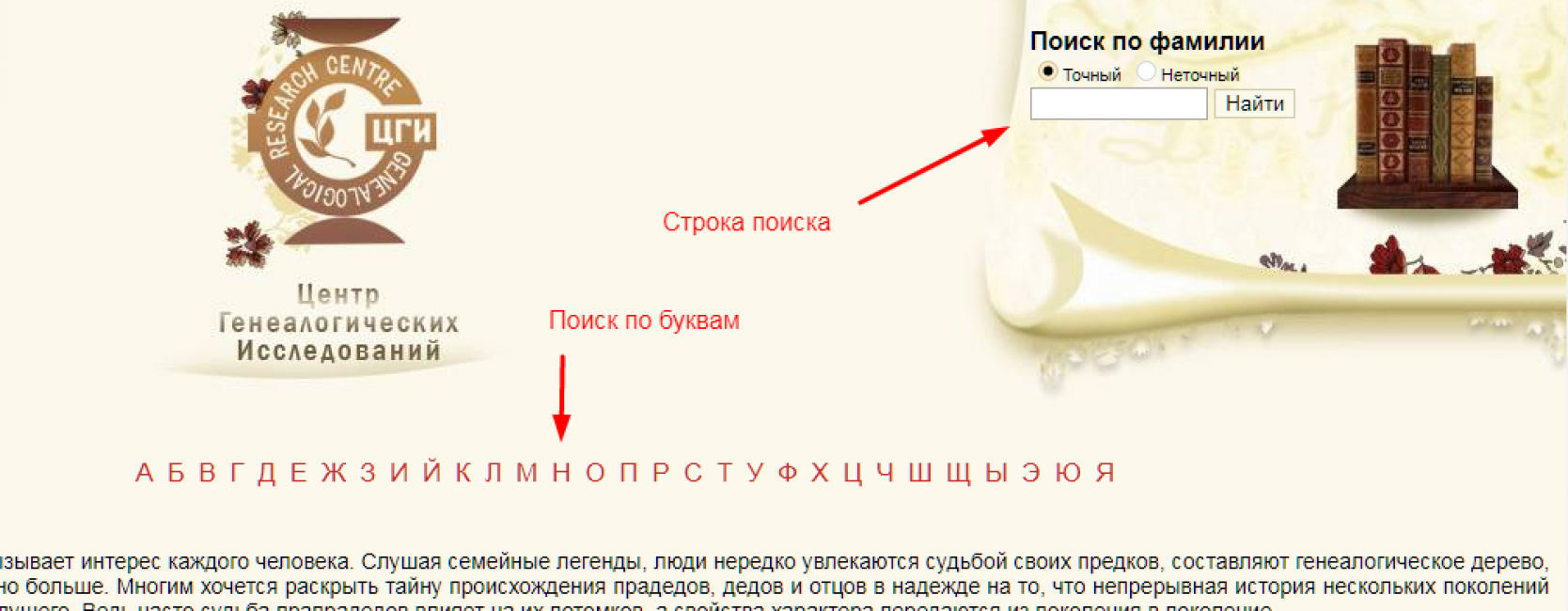 Первый сайт, который будет рассмотрен: http://rosgenea.ru/ — ЦГИ. Ресурс создан для тех, кто хочет отыскать своих родственников. У него есть несколько существенных преимуществ: