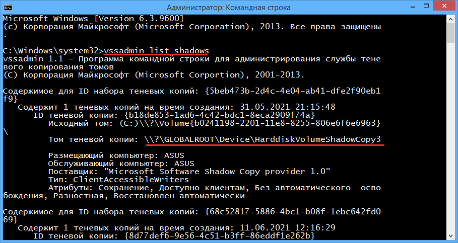 Как вы поняли, том теневой копии в команде это HarddiskVolumeShadowCopy1, к которому указывается путь (начинается с двух слешей).
