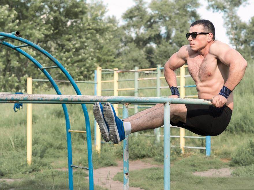 - Возьмитесь за брусья и поднимитесь на прямых руках.