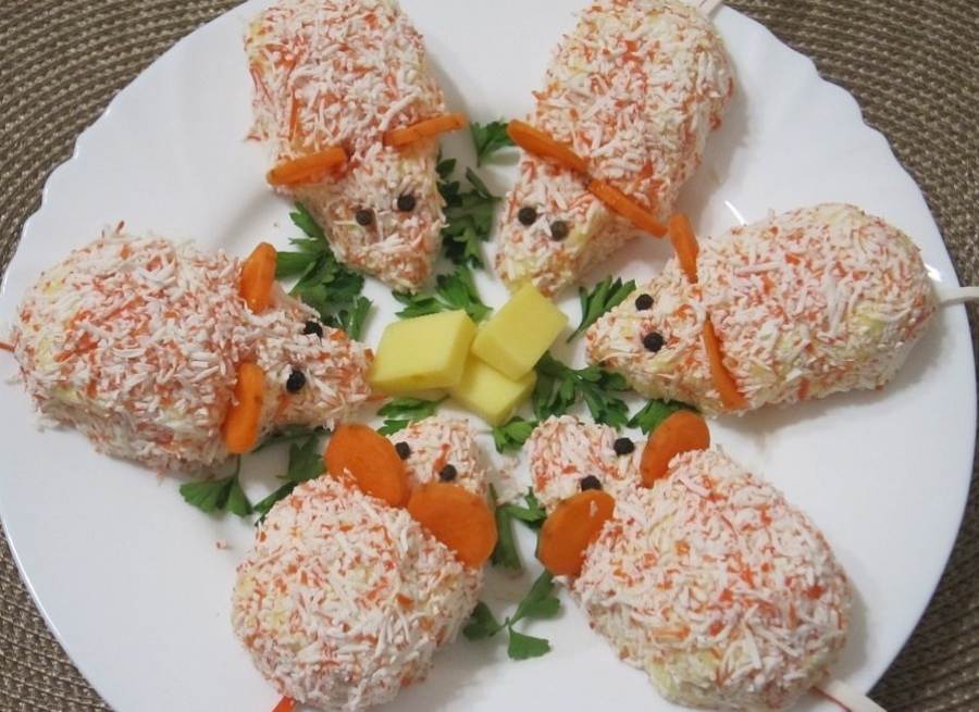 Салаты выложить в какой-нибудь необычной форме и украсить – в виде животного, например. С бутербродами поступить так же, или же предпочесть им канапе. Из сырной или мясной нарезки вырезать интересные фигуры, побуждающие к аппетиту.