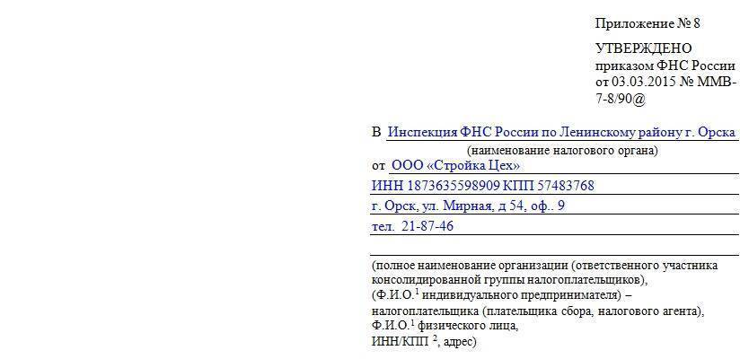 Сначала в верхней правой части документа указываются сведения об адресате заявления и его авторе. Здесь указывается название и номер конкретной налоговой службы, а также информация о налогоплательщике: