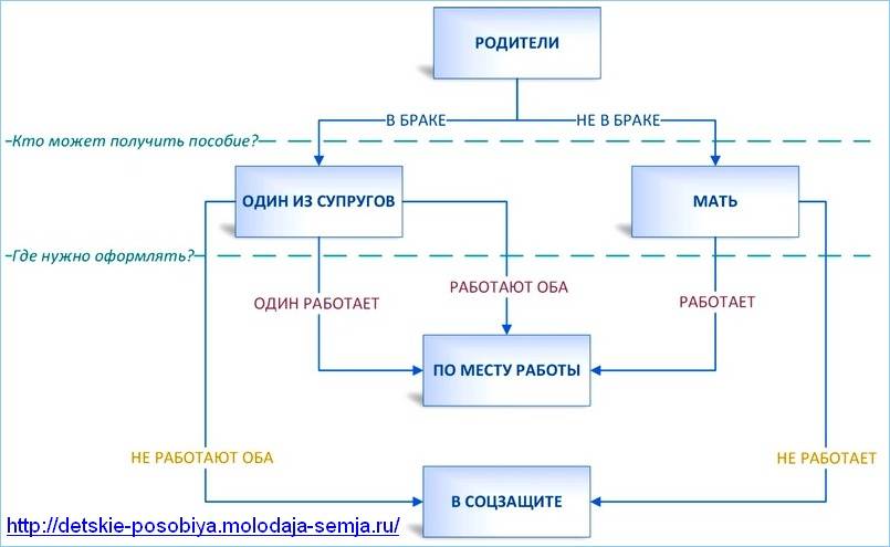 Если один из родителей трудоустроен или проходит службу, а другой не работает, то оформление и выплата происходит по месту работы или службы.