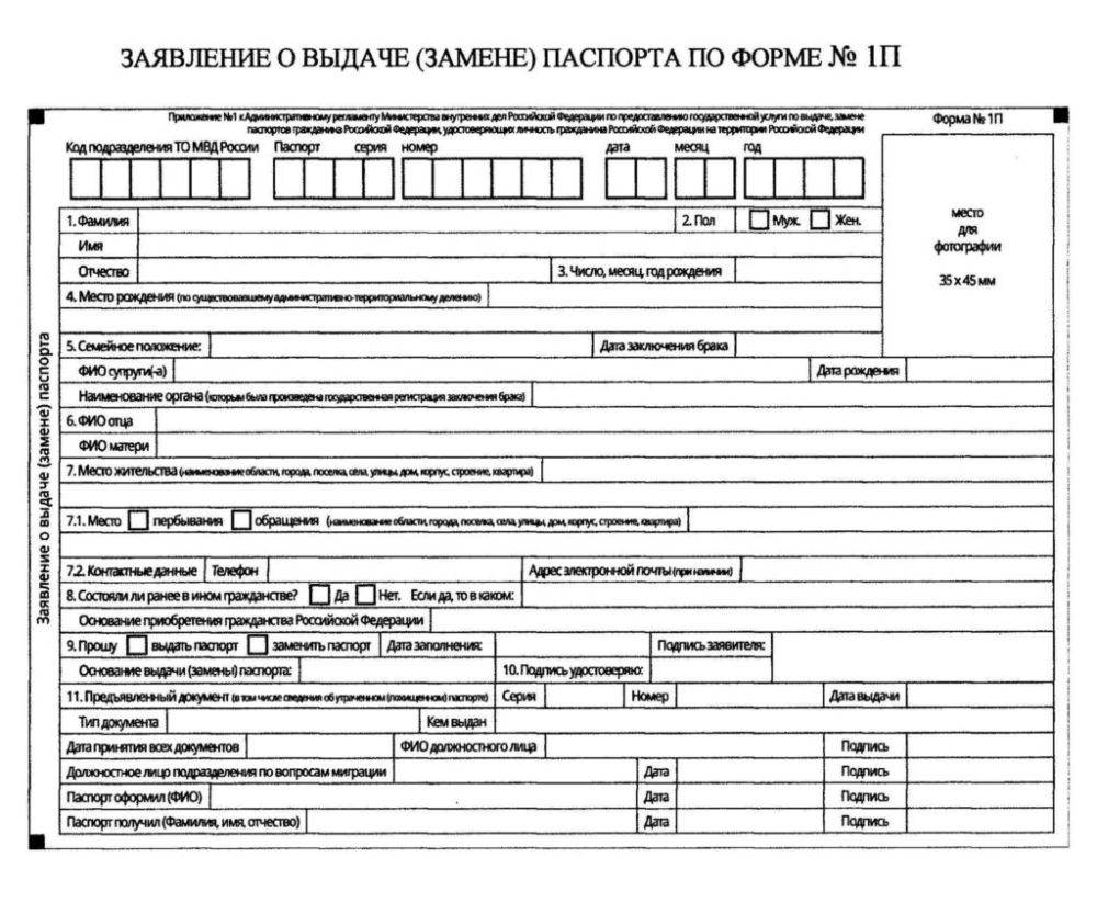 Процедура запускается на основании заявления по форме 1П. Бланк о восстановлении паспорта содержит информацию: