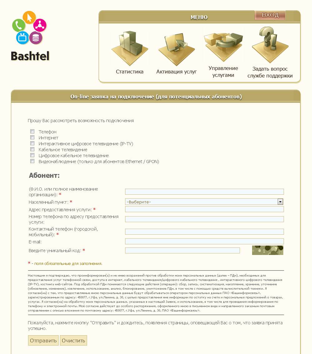 - Воспользоваться официальным сайтом компании «Башинформсвязь» — www.bashtel.ru. Зайдите на главную страницу, найдите раздел «Заявка на подключение», перейдите туда и укажите личные и контактные данные, адрес. Пройдите защиту от автоматического заполнения и нажмите «Отправить». Дождитесь обратной связи от компании.