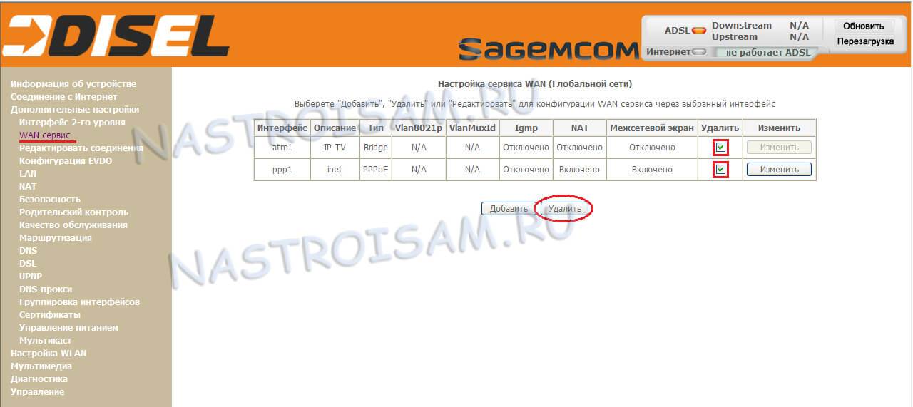 Ставим флажки «Удалить» на всех имеющихся подключения и удаляем их. Переходим в «Настройки 2-го уровня»->»Интерфейс ATM PVC»: