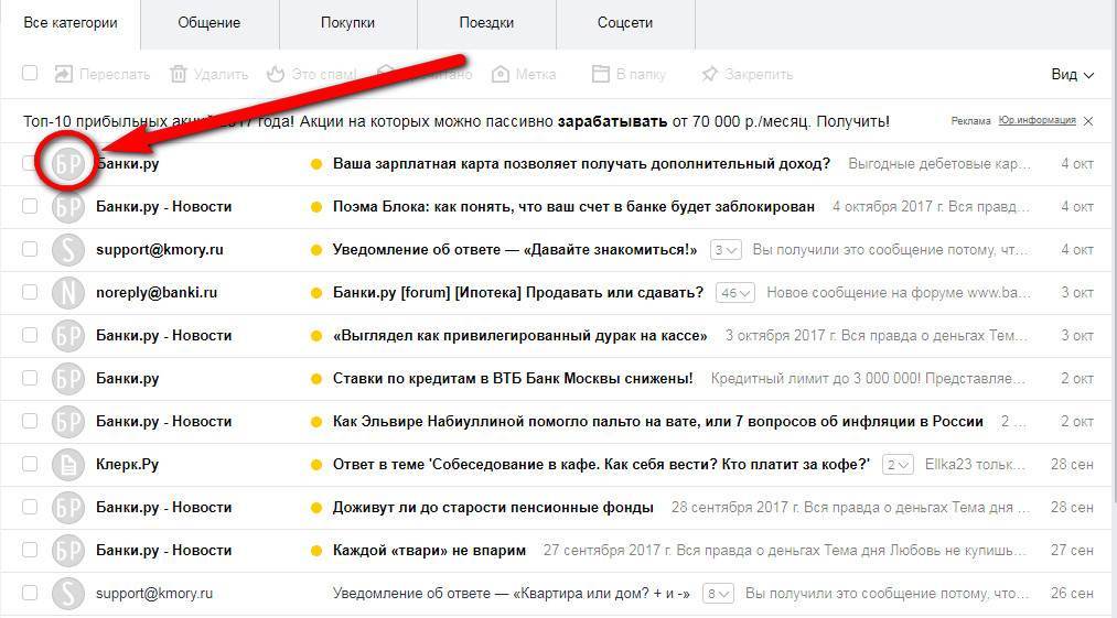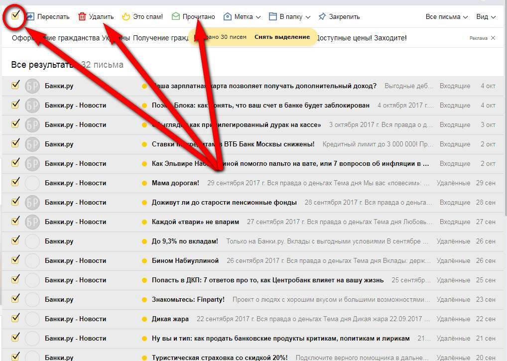например, выберем все письма с сайта Банки.ру. После нажатия на значок адресата система откроет все письма от этого отправителя (в том числе и те, которые уже были прочитаны). Чтобы выделить все письма, ставим галочку в самом верхнем меню: