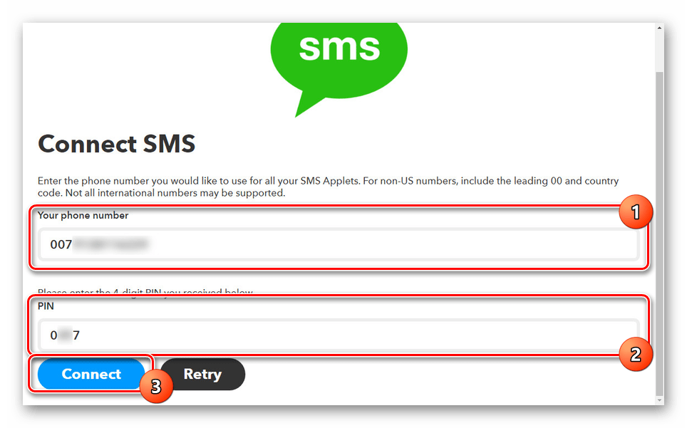 После нажатия кнопки «Send PIN» на телефон, если он поддерживается сервисом, будет направлено SMS со специальным 4-значным кодом. Его нужно ввести в поле «PIN» и щелкнуть по кнопке «Connect».