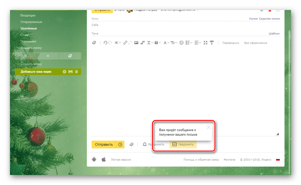 Увы, в Яндекс почте нет такой функции. Этот сервис ограничился лишь тем, что может прислать уведомление, что отправленное письмо действительно было доставлено по указанному адресу и находится в нужном постовом ящике. И все. Для этого перед тем, как отправить письмо, нужно нажать “Уведомить”, и, как только письмо будет доставлено, вам придет уведомление от Яндекса: “Ваше письмо было успешно доставлено указанному адресату”.
