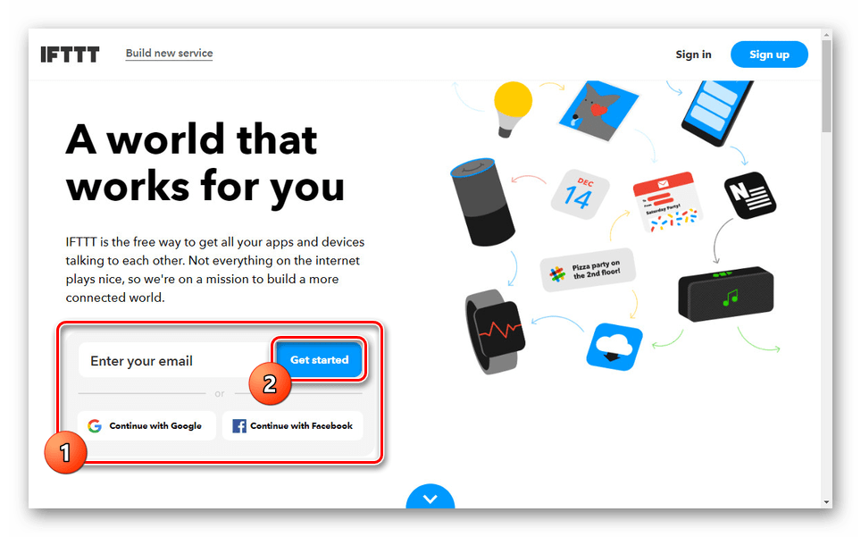 - Воспользуйтесь указанной нами ссылкой и на стартовой странице в поле «Enter your email» введите адрес электронной почты для регистрации учетной записи. После этого нажмите кнопку «Get started».