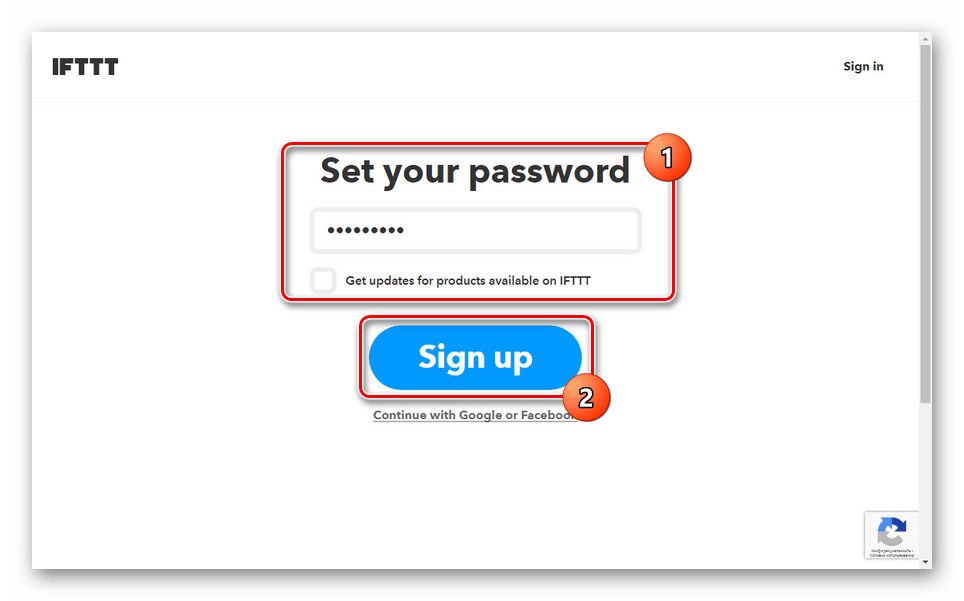 На открывшейся странице нужно указать желаемый пароль и щелкнуть по кнопке «Sing up».