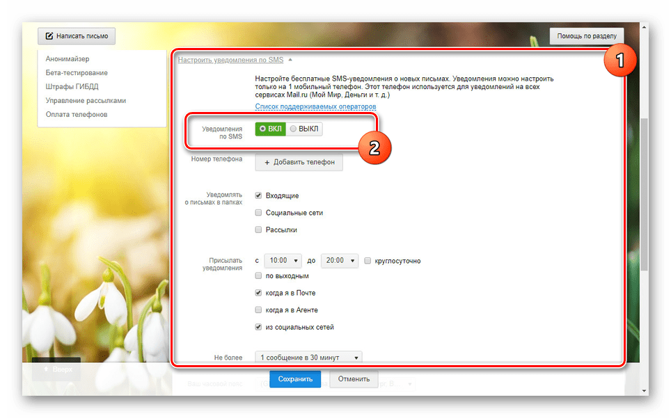 В отличие от любого другого почтового сервиса, Mail.ru по умолчанию предоставляет возможность подключения СМС о событиях в аккаунте, включая получение новых входящих писем. Такая функция имеет серьезное ограничение в плане количества используемых номеров телефона. Подключить подобного рода оповещения можно в настройках аккаунта в разделе «Уведомления».