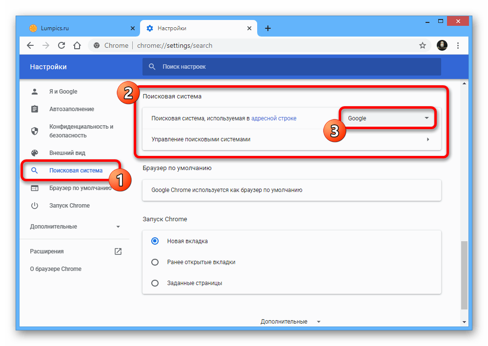 Пролистайте страницу до блока «Поисковая система» или используйте соответствующий пункт в меню слева. Здесь необходимо установить значение «Google», чтобы на новой вкладке отображался именно поиск по умолчанию.