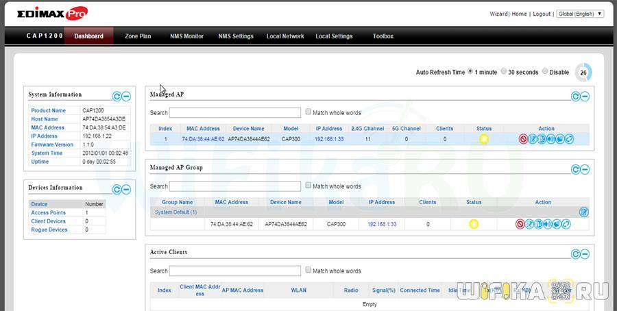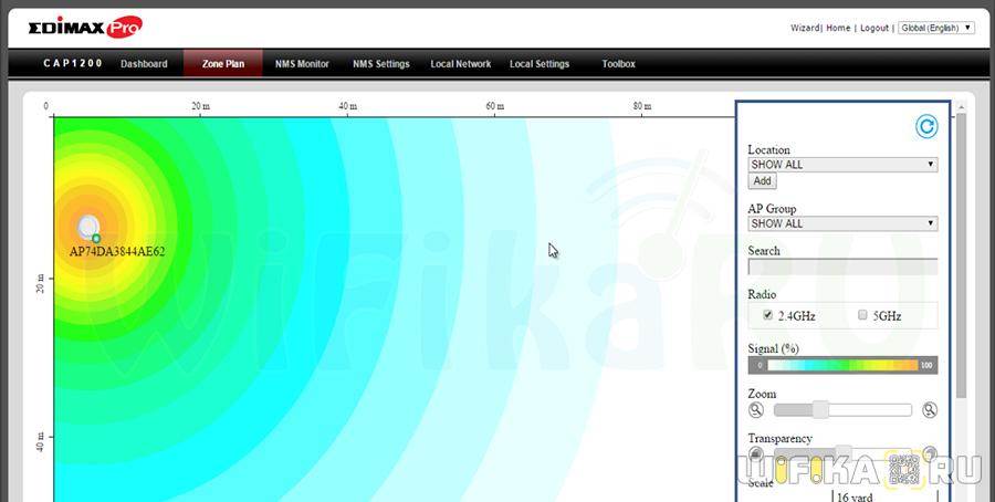 Обратим внимание на одну интересную фишку данной админки — для удобства администрирования площади покрытия сети можно загрузить план территории помещения с отображающимися на ней всеми работающими точками доступа