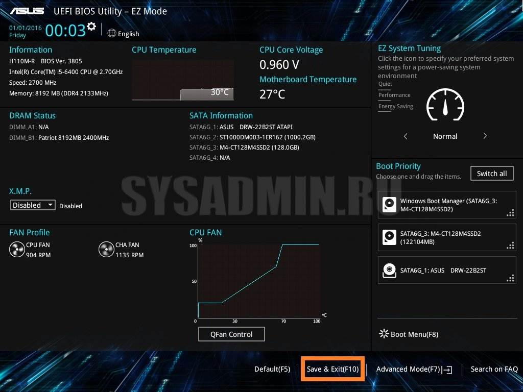 - Для сохранения измененных параметров, пользователю необходимо нажать на раздел Exit (выход из окна) и сохранить, нажав Enter.