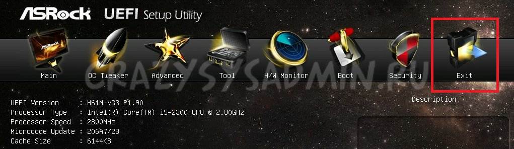 Стрелками клавиатуры (влево, вправо) переходим во вкладку верхнего меню под названием “Exit”.