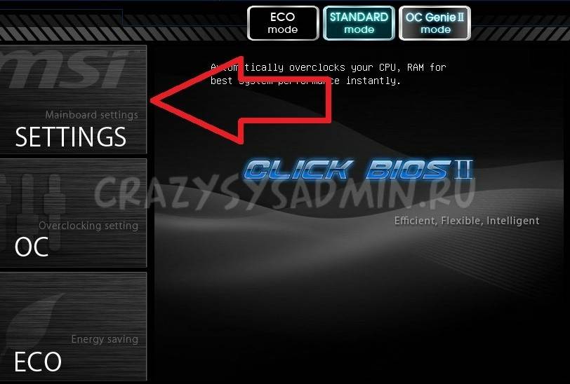 В главном меню BIOS выбираем пункт “Mainboard settings” (“Settings”).