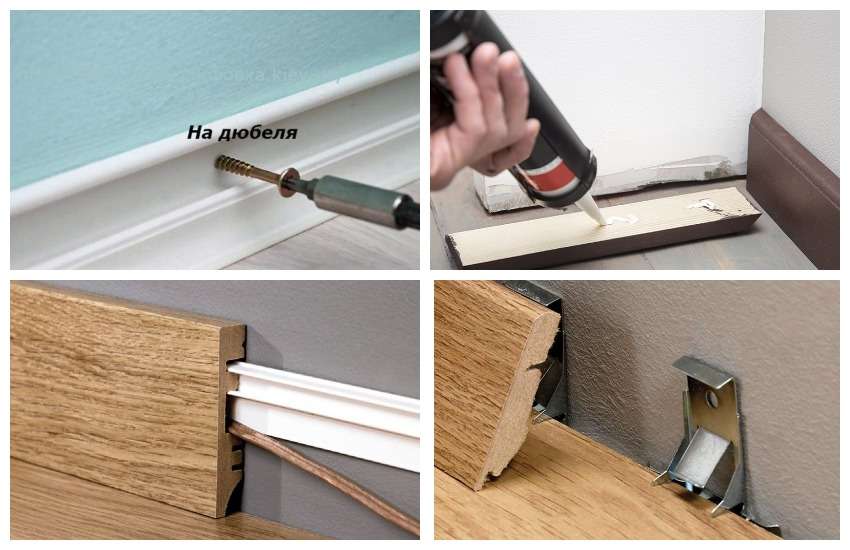 Крепление плинтусов должно обеспечивать прочность и быть максимально незаметным. В качестве крепежа применяются: