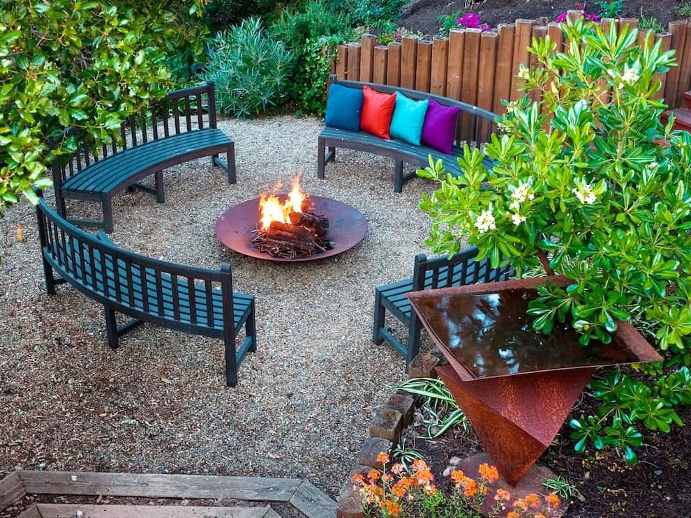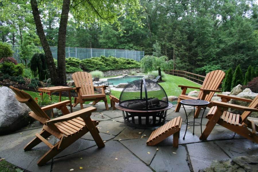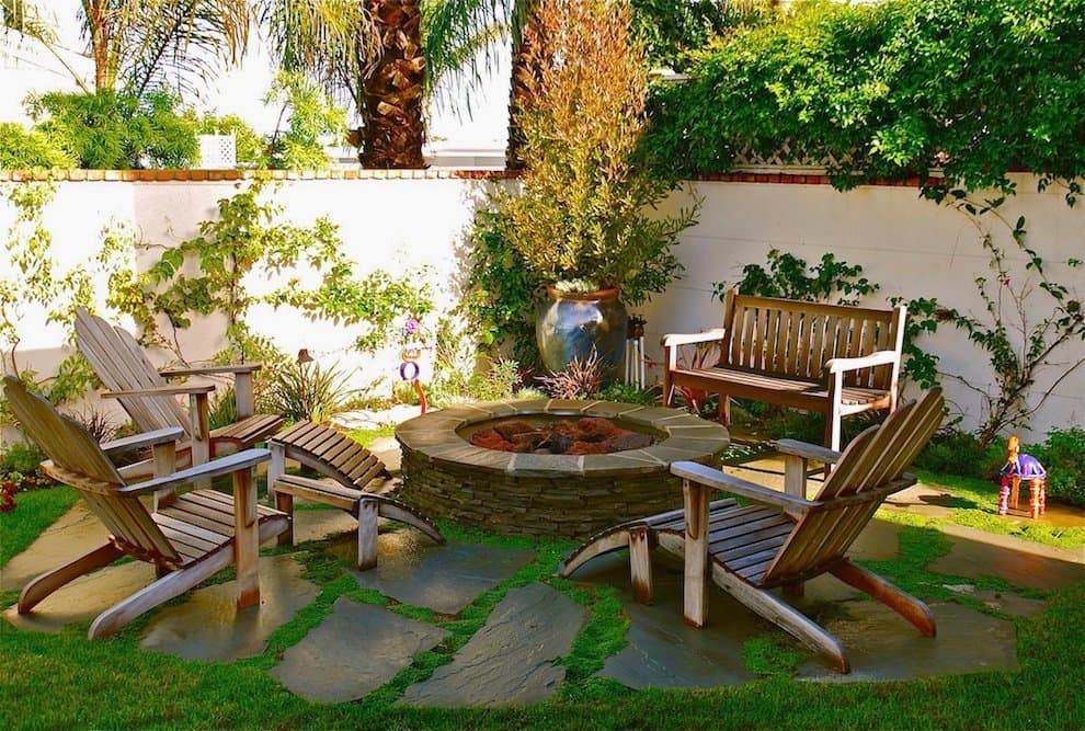 Отдельная зона для очага. Это может быть беседка с каменным камином или массивной печью. Садовые дорожки и мебель можно привязать именно к этому месту. Неплохое решение – применение лучевой схемы.