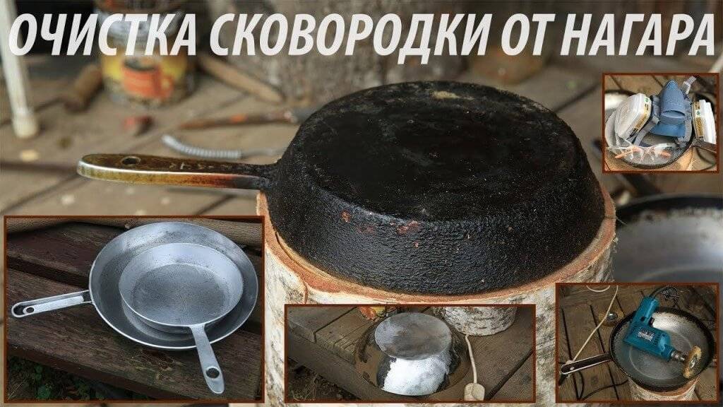 Тут все гораздо проще и особый инструмент не пригодится. Нагар и годовалый жир из чугуна можно удалить с помощью огня. Подробнее, как очистить старую чугунную сковородку: