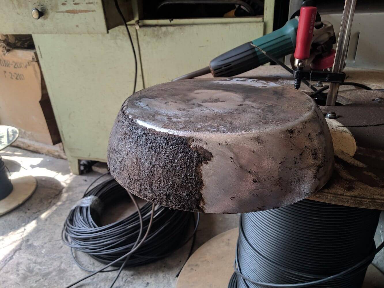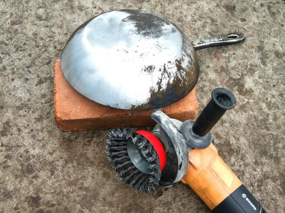 Начнем, пожалуй, с самых сложных методов того, как очистить старую чугунную сковороду. Эти способы эффективны, но лучше их передать мужчинам, которые, как правило, дружат с инструментом.