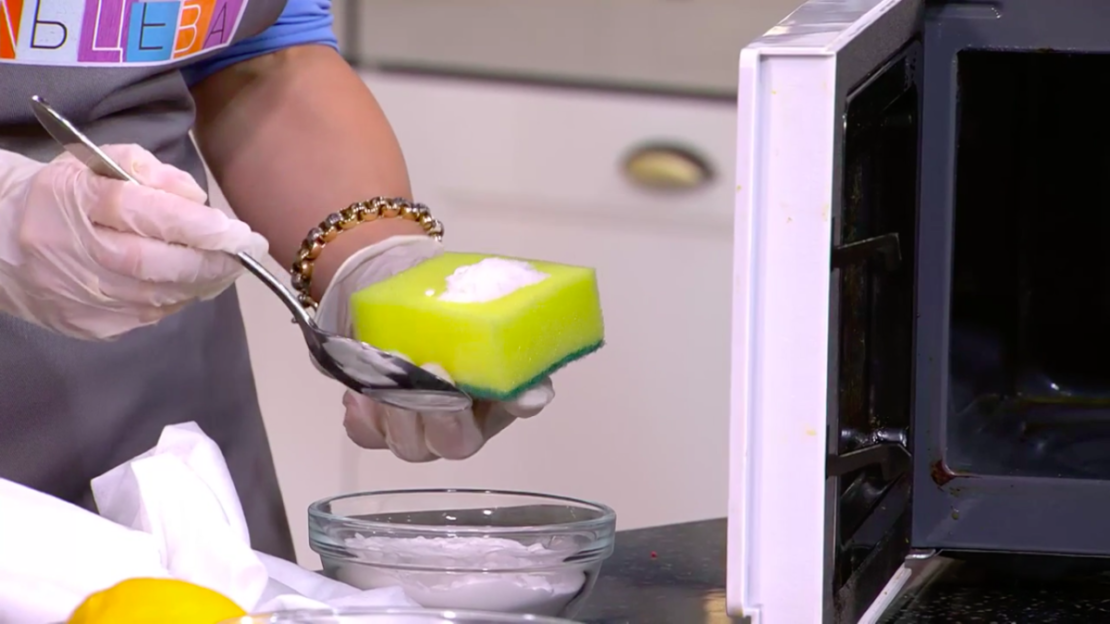 Самый доступный и безопасный вид щёлочи, используемый в домашнем хозяйстве, — двууглекислый натрий или пищевая сода. В печку с эмалевым покрытием поставьте ёмкость с водой, в которой растворена столовая ложка соды. 5 минут работы на полной мощности помогает легко удалить среднего уровня загрязнения. Содой можно обрабатывать печи с любым покрытием, керамическим, стальным, эмалевым, избавляя их не только от грязи, но и болезнетворных бактерий. Сода обладает сильным бактерицидным эффектом.