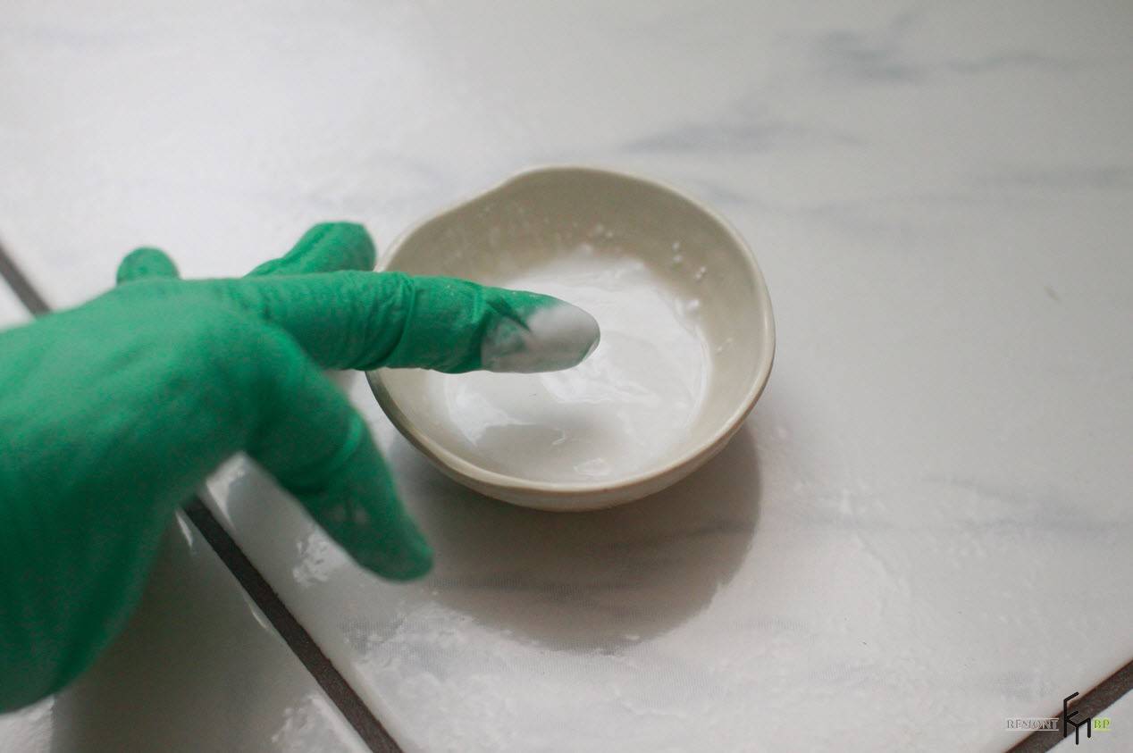 - Оставьте на 10 минут для прохождения реакции, после чего протрите швы влажной салфеткой или губкой. При необходимости повторите манипуляции.