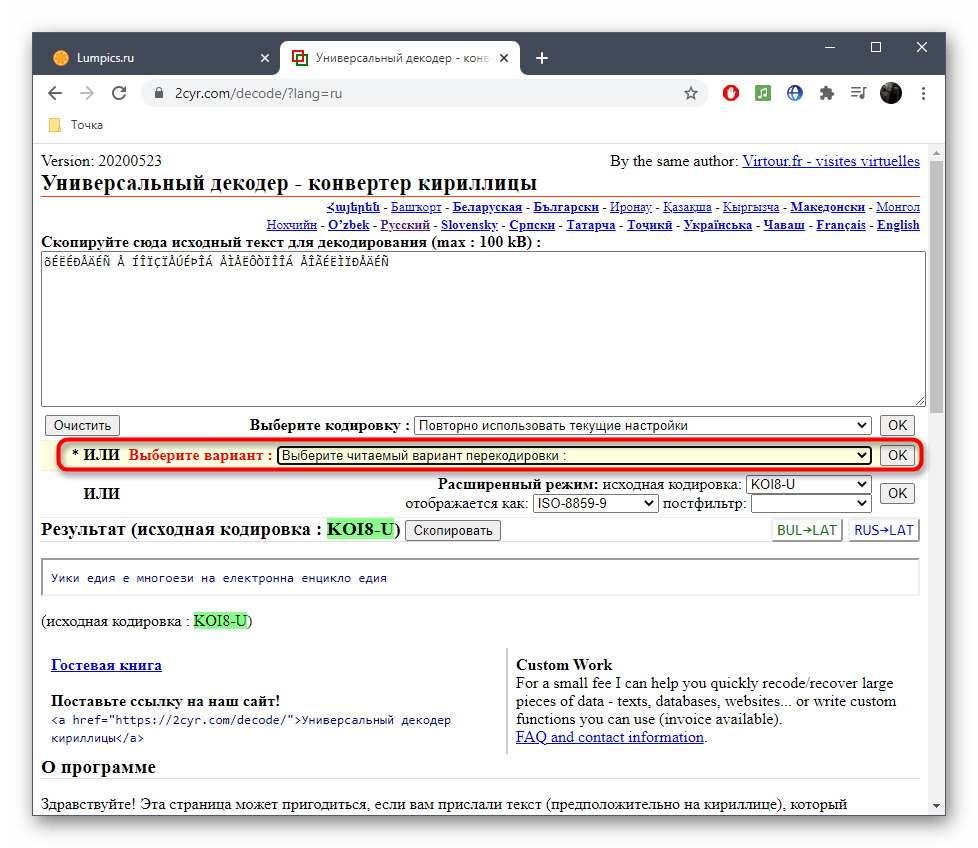 Ничего не помешает сохранить или запомнить этот онлайн-сервис и обращаться к нему в те моменты, когда требуется перевести кодировку или снова определить ее. Если же этот вариант не подходит, переходите к рассмотрению следующих сайтов.