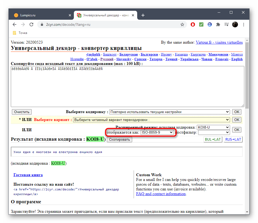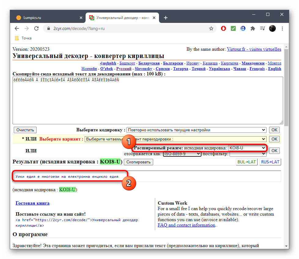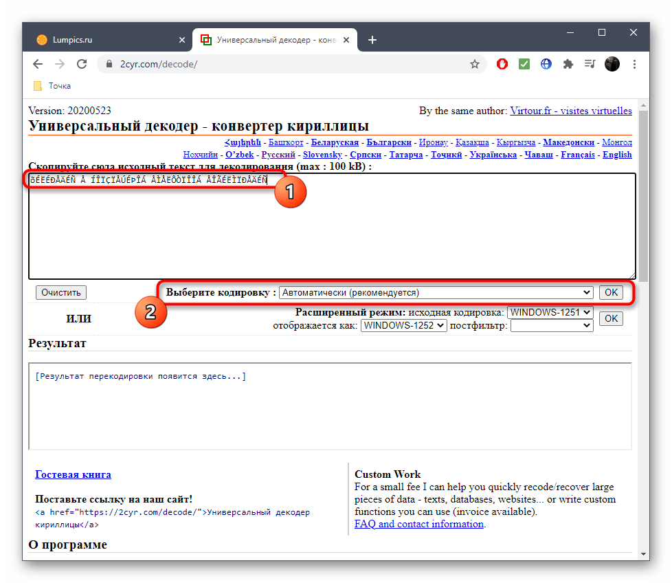 Основное предназначение онлайн-сервиса 2cyr заключается в декодировании определенного отрывка текста, однако это не помешает использовать встроенные в него инструменты для определения кодировки, для чего потребуется только скопировать небольшую надпись.