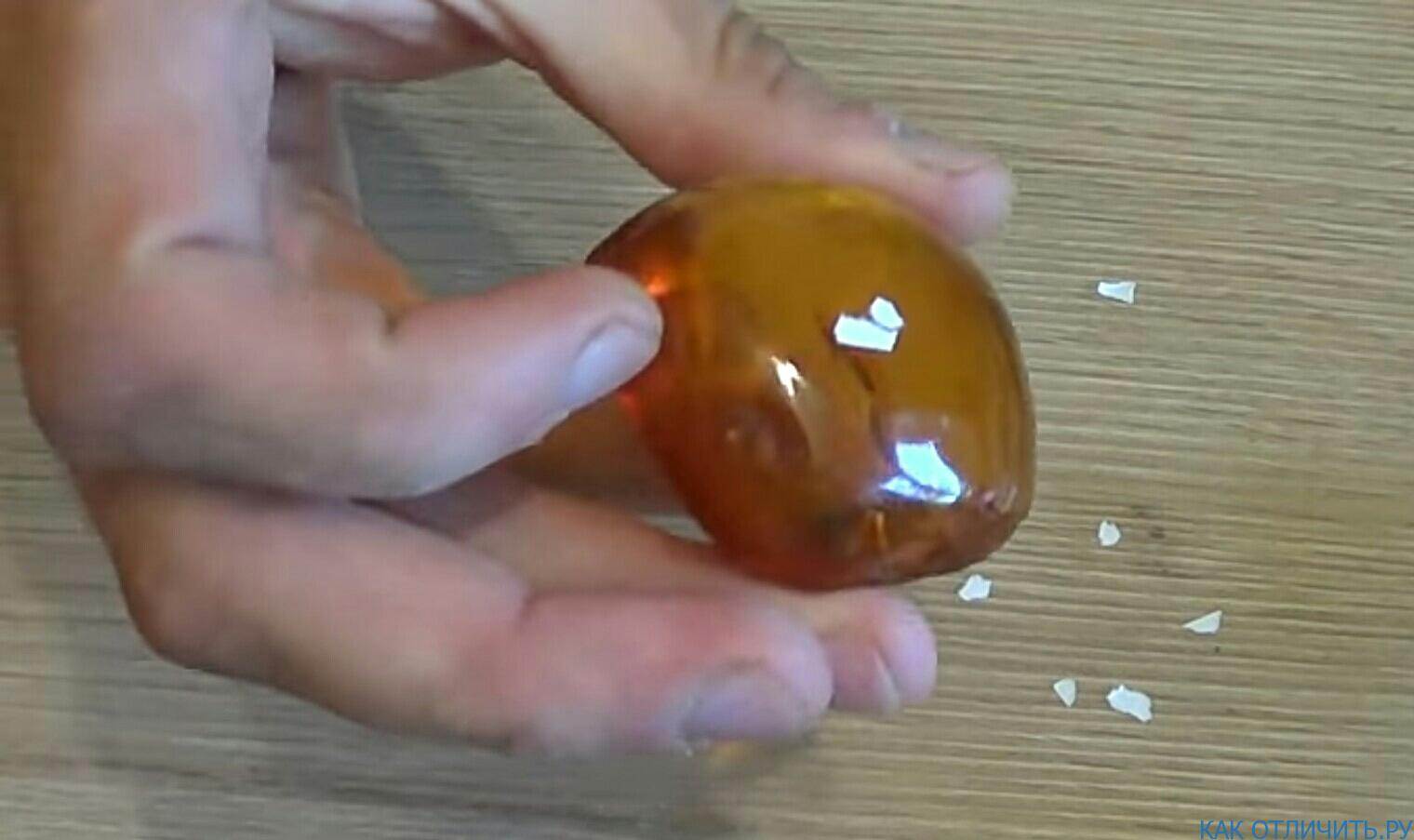 Натуральный камень подвержен механическому воздействию, но реагирует на него специфическим образом. Чтобы отличить янтарь от подделки, проведите иглой по внешней поверхности с легким нажимом. По типу царапинки вы легко определите натуральный янтарь или нет.