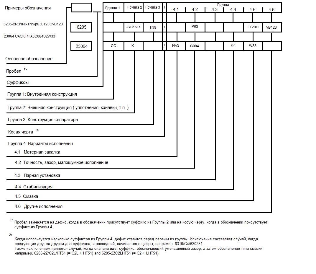 Но кроме основного ядра, согласно требованиям ГОСТ, есть также обозначения, приведенные в крайних правой и левой частях маркировки закрытых подшипников. Рассмотрим эти правила.