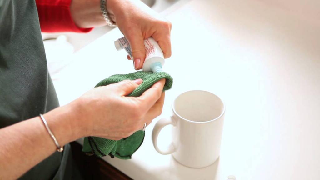 Весьма оригинальный способ, хотя сегодня зубную пасту часто используют не по назначению. Обычная зубная паста с отбеливающим эффектом эффективна не только для придания ослепительной белизны вашим зубам. Многие хозяйки с успехом используют ее для удаления следов от любимых напитков с кружек и чашек. В состав зубной пасты входят мягкие абразивы: дегидратированные силикагели, карбонат кальция, фосфатные соли, карбонаты магния и силикаты, удаляющие поверхностные пятна. Механизм их удаления очень напоминает то, что происходит, когда вы каждый день чистите зубы.
