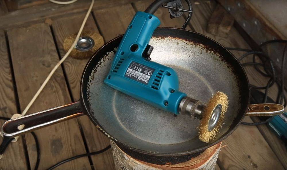 - После приготовлений можно начинать процедуру очистки: обработать дрелью сковороду, снимая нагар слой за слоем.