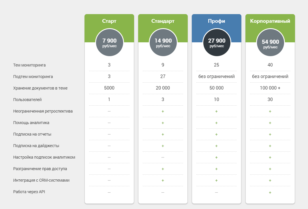 Стартовый тариф за 7900 рублей/месяц включает в себя работу только с одним пользователем и тремя темами мониторинга.