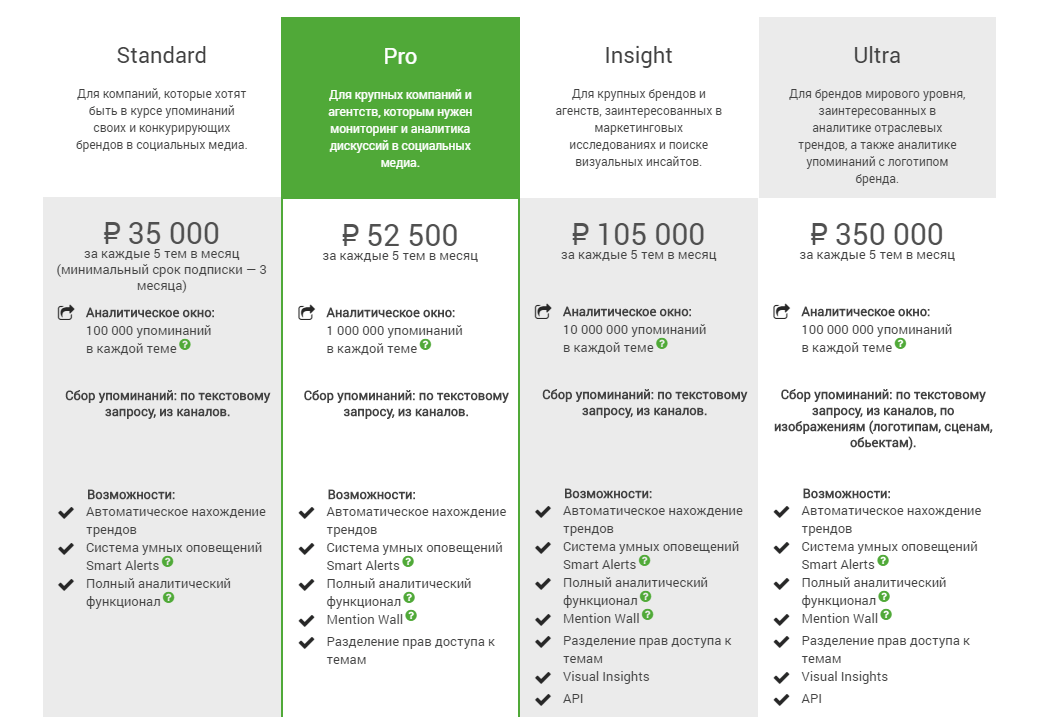 Тарифы — от 35 до 350 тысяч рублей в месяц с системой умных оповещений и автоматическим сбором упоминаний с выбранных каналов.