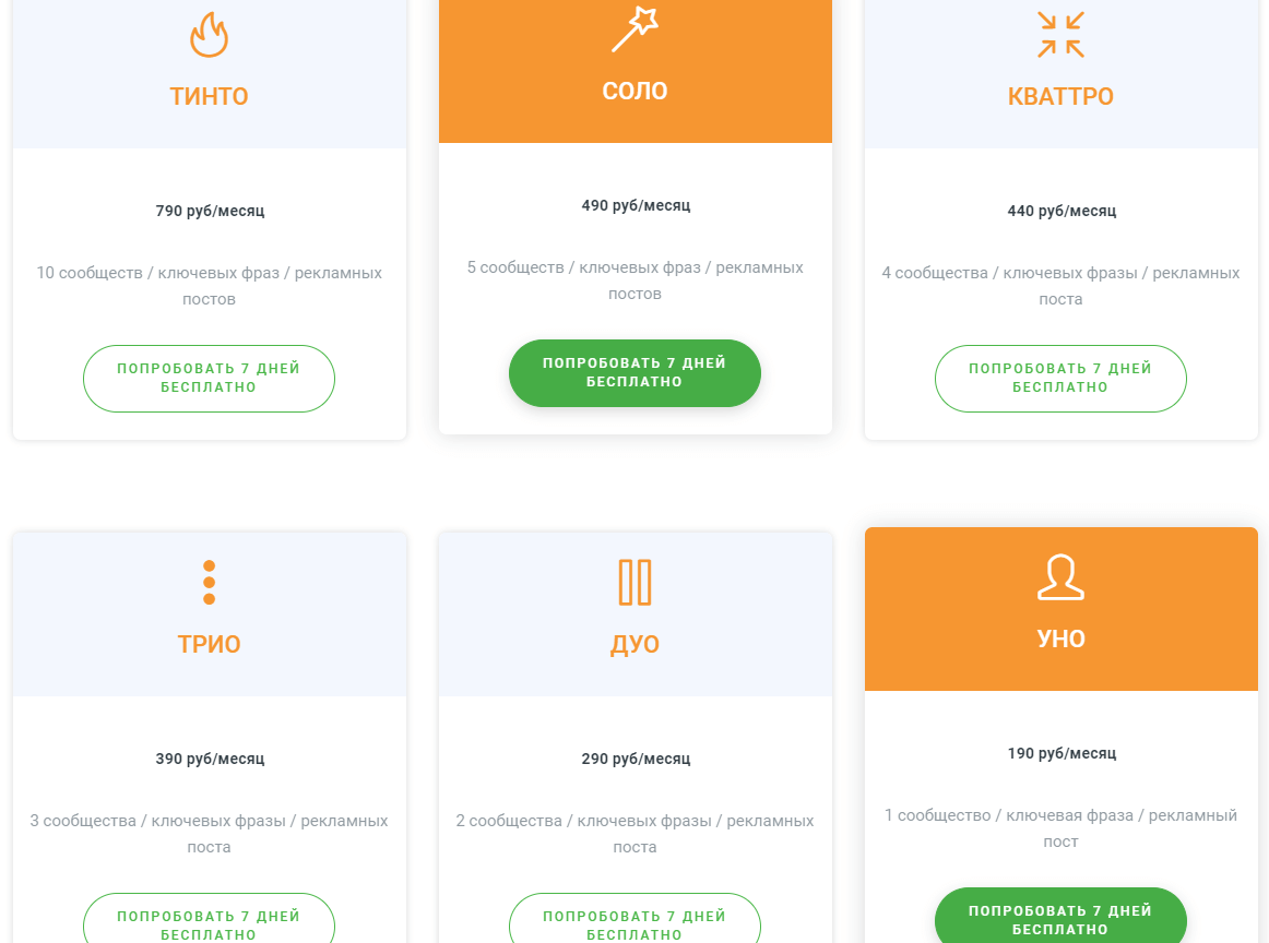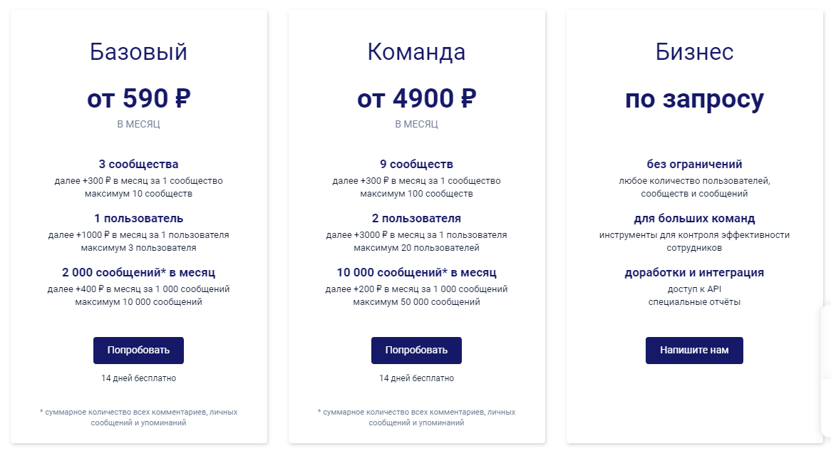 Поддерживает шесть социальных сетей. Ищет упоминания, сообщения, комментарии, ключевые слова. Предлагает один из самых широкий выборов тарифов, а также возможность согласовать для себя индивидуальный тариф. Стоимость варьируется от 190 рублей/месяц (за 1 подключенное сообщество) до 5500 рублей/месяц (за 100 сообществ). Любой из вариантов доступен для бесплатной пробы на протяжении 7 дней.