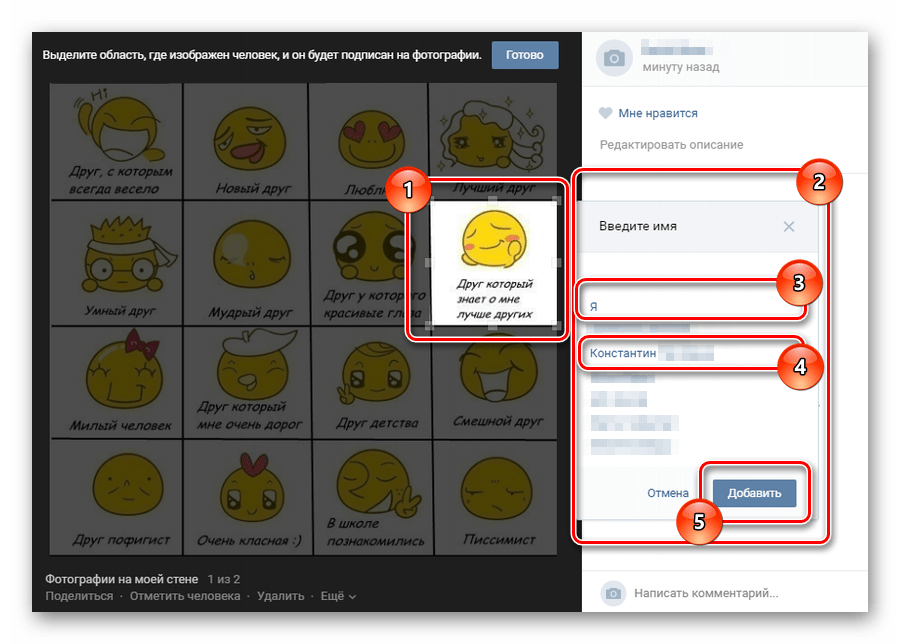 Далее необходимо будет выбрать область фотографии и выбрать пользователя из перечня, предложенного Вконтакте;