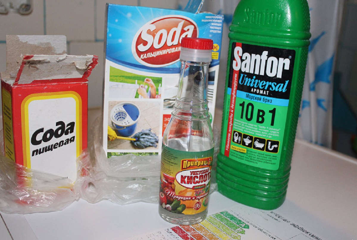 - Сделайте смесь из 1 упаковки лимонной кислоты, 50 г уксусной эссенции и 1 ст. л. пищевой соды.