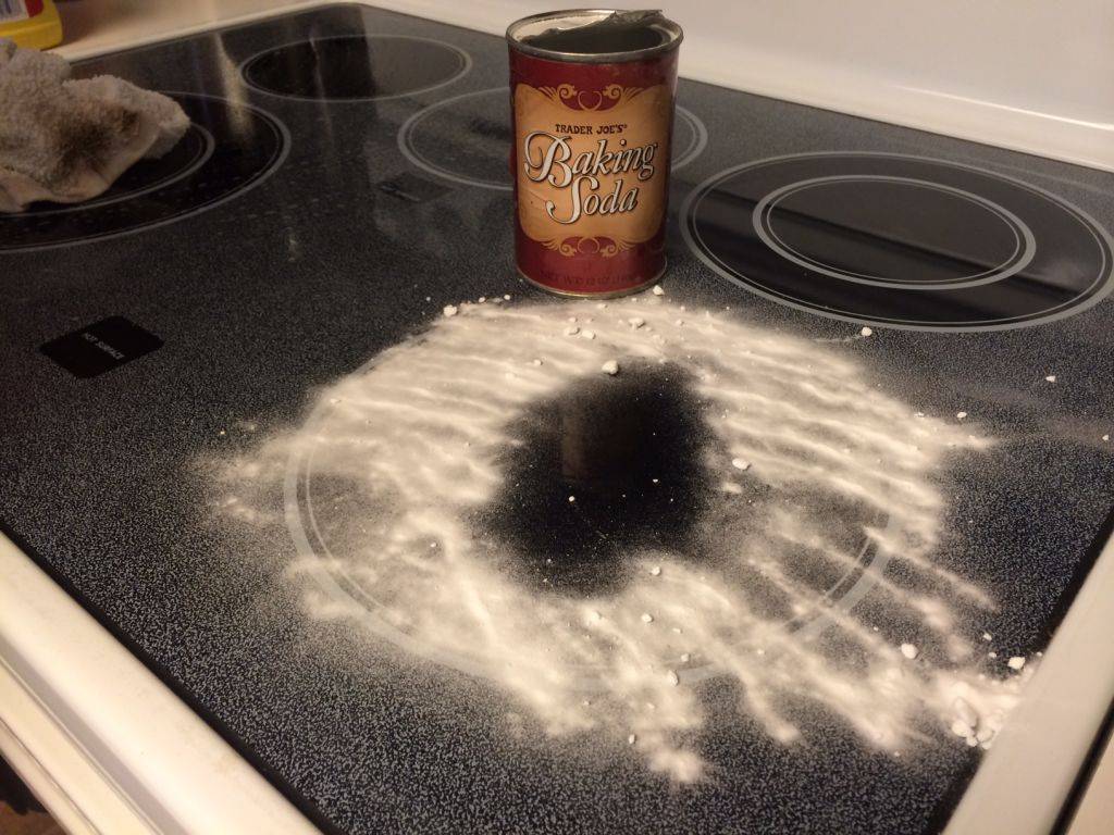 - Первым делом нанесите на поверхность варочной панели уксус. Сверху положите пищевую соду и дождитесь начала реакции.